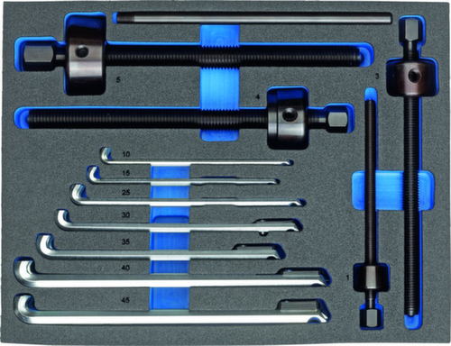 "longDescription": "Jeu d'extracteurs de roulements à billes pour plus de 40 roulements à billes, Pour l'extraction de roulements à billes qui sont montés sur un arbre et en même temps dans un logement, Extraction non destructive de roulements à billes à gorge profonde sans démontage de l'arbre, aucun alésage de la cage de roulement n'est nécessaire (sans copeaux), Avec insert Check-Tool pour la détection rapide de l'outil manquant, Insert utilisable dans des tiroirs de dimensions minimales 340 x 260 x 60 mm<br>",