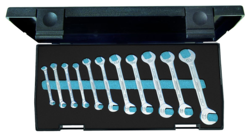 "longDescription": "- Contenu 10 pièces : No. 8 4,5 5,5 6 7 8 9 10 11 12 13, Avec ouvertures de clé identiques, position de la mâchoire 15° et 75°, Acier au chrome-vanadium 31CrV3, chromé, Dans coffret plastique<br>",