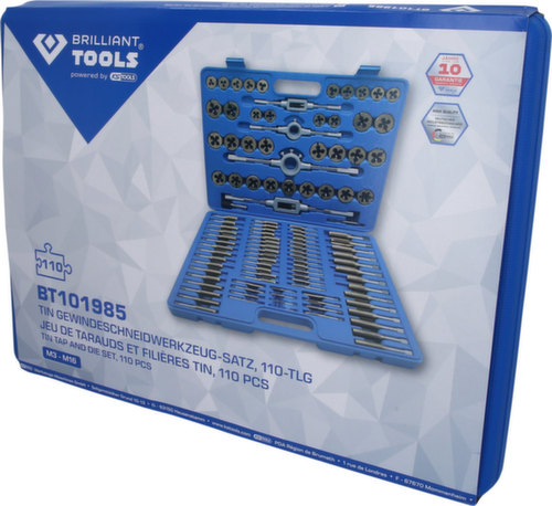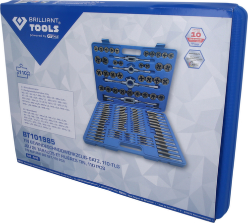 "longDescription": "<ul><li class=\"liste\">Jeu de 110 pièces</li><li class=\"liste\">métrique</li><li class=\"liste\">M2 - M18</li><li class=\"liste\">pour la réalisation de filetages intérieurs et extérieurs DIN 352 - DIN 223</li><li class=\"liste\">outils de coupe revêtus de titane</li><li class=\"liste\">y compris pré- et post-coupeur</li></ul><br />Le jeu d'outils de filetage BT101985 de BRILLIANT TOOLS est un jeu de 110 outils de filetage. Les outils de coupe revêtus de titane permettent de réaliser des filetages intérieurs et extérieurs de M2 à M18. Il comprend 2 tarauds, pré-tarauds et tarauds à refouler, pour chaque taille.<br /><br /><strong>Contenu de la livraison :</strong><br /><br />1 T-grip winders : M2 - M3<br />2 tournevis : M3 - M12, M6 - M20<br />2 porte-tarauds : M2 - M9, M10 - M18<br />35 jeux de tarauds à main 2 pces : M2 x 0,4 mm - M3 x 0,5 mm - M4 x 0,7 mm - M5 x 0,8 mm - M6 x 0,75 mm - M6 x 1,0 mm - M7 x 0,75 mm - M7 x 1,0 mm - M8 x 0,75 mm - M8 x 1,0 mm - M8 x 1,25 mm - M9 x 0,75 mm - M9 x 1,0 mm - M9 x 1,25 mm - M10 x 0,75 mm - M10 x 1,0 mm - M10 x 1,25 mm - M10 x 1,5 mm - M11 x 0,75 mm - M11 x 1,0 mm - M11 x 1,25 mm - M11 x 1,5 mm - M12 x 0,75 mm - M12 x 1,0 mm - M12 x 1,25 mm - M12 x 1,5 mm - M12 x 1,75 mm - M14 x 1,0 mm - M14 x 1,25 mm - M14 x 1,5 mm - M14 x 2,0 mm - M16 x 2,0 mm - M16 x 1,5 mm - M16 x 1,0 mm - M18 x 1,5 mm<br />35 Filières : M2 x 0,4 mm - M3 x 0,5 mm - M4 x 0,7 mm - M5 x 0,8 mm - M6 x 0,75 mm - M6 x 1,0 mm - M7 x 0,75 mm - M7 x 1,0 mm - M8 x 0,75 mm - M8 x 1,0 mm - M8 x 1,25 mm - M9 x 0,75 mm - M9 x 1,0 mm - M9 x 1,25 mm - M10 x 0,75 mm - M10 x 1,0 mm - M10 x 1,25 mm - M10 x 1,5 mm - M11 x 0,75 mm - M11 x 1,0 mm - M11 x 1,25 mm - M11 x 1,5 mm - M12 x 0,75 mm - M12 x 1,0 mm - M12 x 1,25 mm - M12 x 1,5 mm - M12 x 1,75 mm - M14 x 1,0 mm - M14 x 1,25 mm - M14 x 1,5 mm - M14 x 2,0 mm - M16 x 2,0 mm - M16 x 1,5 mm - M16 x 1,0 mm - M18 x 1,5 mm<br /><br />NOTRE QUALITÉ : BRILLIANT<br />NOS PRIX : SMART<br /><br />Chaque outil renferme plus d'un quart de siècle d'expérience de nos experts. Cette qualité sans compromis, des outils professionnels de la plus haute qualité pour le dur travail quotidien, est l'une des recettes de notre succès. Nous renonçons à une grande structure de distribution et à des activités de marketing extravagantes et pouvons donc te proposer les produits à un rapport qualité-prix sensationnel. Economise de l'argent sans baisser tes exigences de qualité !<br /><br />Un outil de qualité powered by KS TOOLS.<br /><br>",