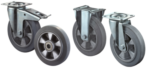 "longDescription": "<h2>Roues en caoutchouc solide élastique non marquant</h2><strong>contre l'usure du sol due à la décoloration</strong><br><ul><li>Durable et résistant à la rouille - le boîtier de direction et les fourches à tréteaux sont en tôle d'acier galvanisée.</li><li>Jante en aluminium</li><li>Polyvalent grâce aux pneus élastiques en caoutchouc solide avec une très faible résistance au démarrage.</li><li>Durabilité et douceur de fonctionnement - avec des roulements à billes</li><li>Bague à billes à double rangée dans la tête de fourche</li></ul>",