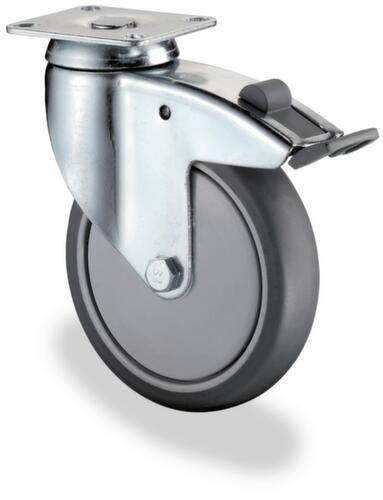 "longDescription": "<h2>Rouleau d'appareil thermoplastique</h2><strong>pour les charges moyennes à lourdes avec changement régulier de l'emplacement</strong><br><ul><li><strong>Résistance et haut pouvoir anticorrosif</strong> - boîtier de direction et chape fixe en acier galvanisé-chromaté</li><li><strong>Faible résistance au démarrage</strong> grâce au bandage caoutchouc thermoplastique</li><li><strong>Souplesse garantie à tout moment</strong> - le pare-fils empêche les fils traînant au sol (p. ex. restes d'emballages) de s'enrouler autour du moyeu de la roue</li><li>bord en matière synthétique</li><li>Durabilité et douceur de fonctionnement - avec roulement à billes</li><li><strong>Mouvement de rotation précis et stable</strong> - roulette pivotante avec double couronne à billes dans la tête de chape</li></ul><br><h3>Le choix vous appartient :</h3><ul><li><strong>Une roulette adaptée à chaque application</strong> - comme roulette pivotante avec ou sans frein, comme roulette fixe ou roue de secours</li><li><strong>Pour vissage direct ou passage d'une vis</strong> - avec plaque ou trou de fixation</li></ul>",