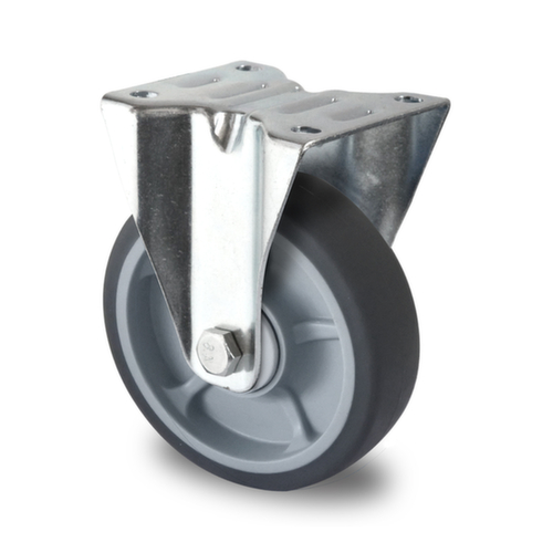 avec bandage TPE préservant le sol. diamètre 125 mm. moyeu avec roulement à billes adapté pour un usage en continu. longueur moyeu 50 mm. jante en polypropylène incassable. boîtier en acier galvanisé en bleu. fixation avec panneau.