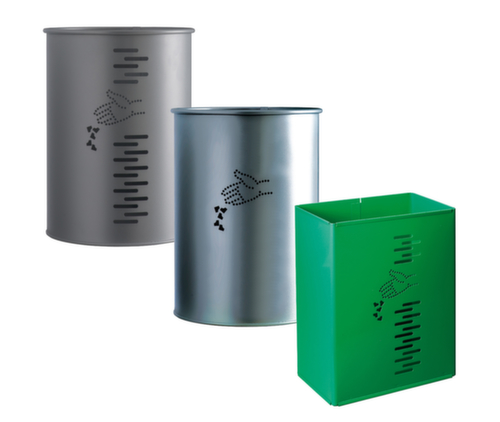 "longDescription": "<h2>Poubelle</h2><strong>Aspect attrayant grâce à la façade perforée</strong><br><ul><li><strong>Élimination facile</strong> - avec sangle élastique pour la fixation de sacs poubelle</li></ul><br><h3>Le choix vous appartient :</h3><ul><li>Accrocheur ou élégant - en tôle d'acier avec revêtement en poudre coloré ou en acier inoxydable.</li><li><strong>Design arrondi ou angulaire</strong> - se pose n'importe où</li></ul>",