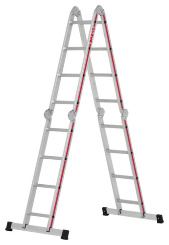 "longDescription": "<h2>Échelle multifonctionnelle</h2><ul><li>Utilisable universellement - comme échelle simple et debout ou comme plate-forme de travail</li><li>Joint à étrier facile à utiliser</li><li>Echelons robustes en profilé laminé</li><li>Utilisation sûre grâce aux joints de sécurité pour le verrouillage et le déverrouillage des éléments de l'échelle.</li></ul>",