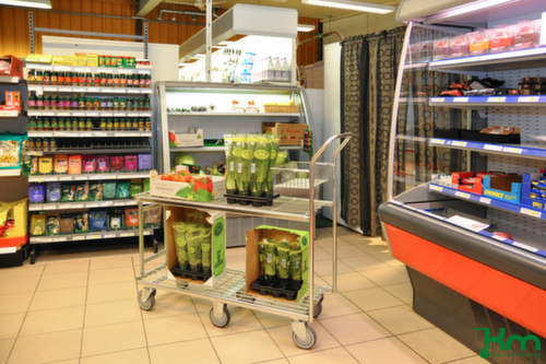 structure en acier. plateforme plateau ajouré. barre de poussée avec panier pour la collecte et le transport spécial de petits objets. châssis à galvanisation électrolytique. Facile à déplacer grâce au châssis roulant robuste avec 4 roulettes pivotantes et 2 roulettes fixes, Les freins situés sur deux roulettes pivotantes offrent la stabilité souhaitée à tout moment. Ø de roue 125 mm. roues avec bandage TPE préservant le sol. moyeu avec palier de pivotement. Permet une rotation à 360°.