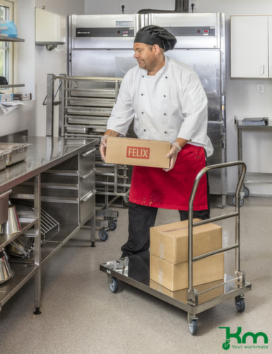 structure en acier inoxydable. plateforme en acier inoxydable. barre de poussée rabattable. Manœuvre et déplacement aisés grâce à 4 roulettes pivotantes, 2 roulettes avec freins. Ø de roue 100 mm. roues avec bandage polyuréthane très résistant et silencieux.