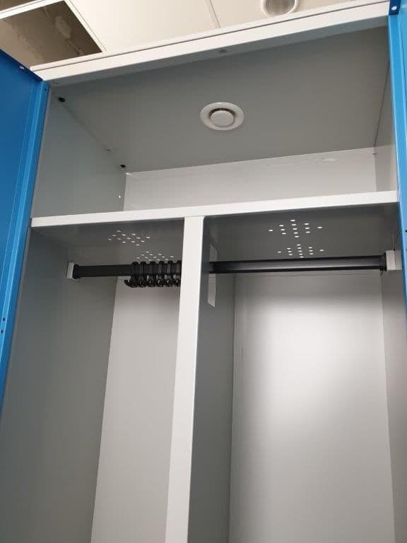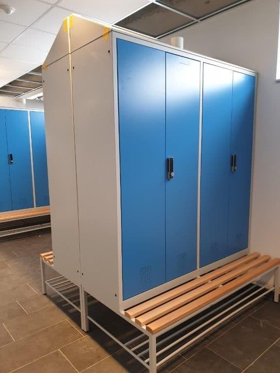 Lors de la consultation du projet sur place, la solution produit suivante a été définie avec le consultant d'UDO BÄR : 97 armoires avec banc et étagère à chaussures en dessous. Chaque armoire est composée de 2 compartiments de 400 mm de côté avec des portes communes verrouillables, avec une cloison au milieu, une étagère à chapeau continue et une tringle à vêtements avec 3 crochets coulissants. Équipements spéciaux : système de fermeture électronique, toits inclinés avec volets en tôle (système de ventilation).