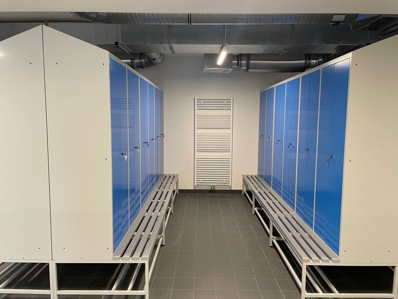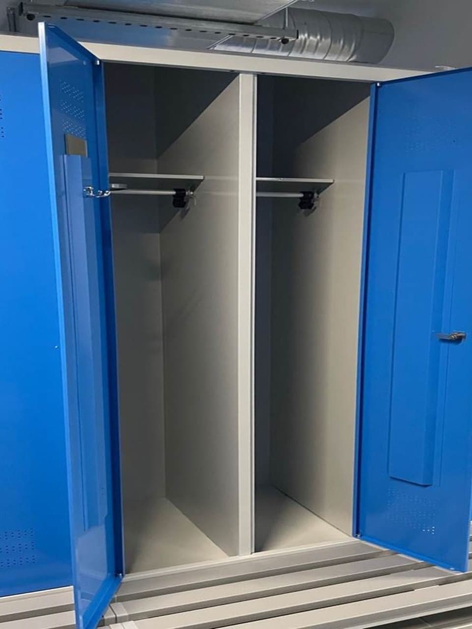 91 Armoires avec 4 étagères pour 182 MA en version spéciale : avec toit incliné, banc, système de fermeture et aménagement intérieur.