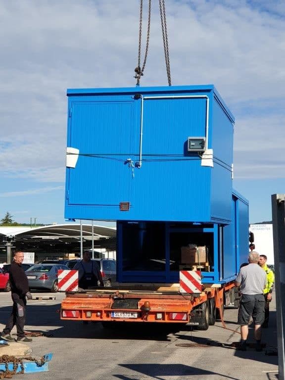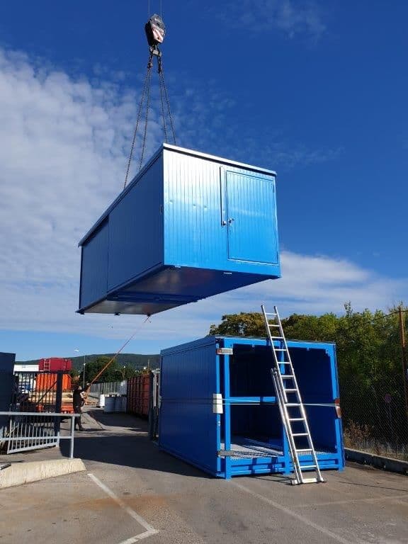 Conteneur de protection des eaux LaCont, volume de collecte 6 x 550 litres L x P x H 12.200 x 2.910 x 2.800 mm. Confortablement et fonctionnellement équipé avec : Chauffage par ventilateur, éclairage LED, boîtier d'interrupteurs, rampe et un petit support pour les petits objets.