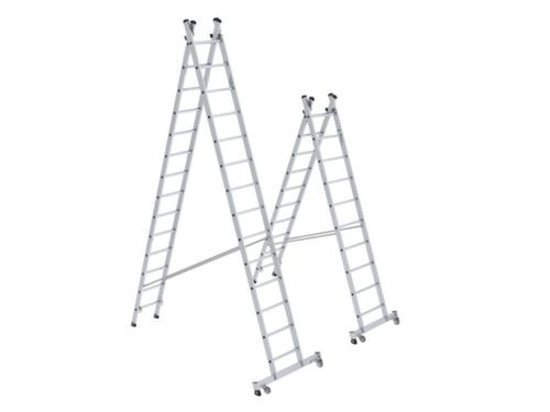 "longDescription": "<h2>Échelle combinée multifonctionnelle</h2><strong>une sécurité accrue grâce à la barre transversale nivello®.</strong><br><ul><li>Utilisation universelle - comme échelle simple, escabeau et échelle à coulisse</li><li>Montée et descente sans accident - échelons avec nervures antidérapantes</li><li>Stabilité - avec des ceintures de sécurité pour éviter la dispersion</li><li>Raccords rung-holm à brides</li><li>Durables et légers - montants en profilés d'aluminium pressé et raccords en acier</li><li>Extra stable - large traverse nivello® pour le boulonnage et patins d'échelle nivello® antidérapants</li></ul><br>Cette échelle multifonctionnelle de Günzburger Steigtechnik est un véritable ensemble combiné et une offre de pointe avec des mesures de protection extraordinaires et une garantie de 15 ans. <br><br>Il est disponible en version en deux parties, avec différents nombres d'échelons et, au choix, avec ou sans rouleaux de transport. Toutes les versions sont dotées de montants robustes en profilés d'aluminium emboutis, de raccords robustes en acier et de connexions à brides entre les montants. Les échelons carrés sont nervurés et antidérapants, ce qui permet de se tenir debout en toute sécurité.<br><br>L'échelle multifonctionnelle peut être utilisée comme escabeau et échelle à coulisse double ou comme échelle simple. Si vous optez pour l'échelle avec la traverse standard, elle convient parfaitement à une utilisation stationnaire. La traverse roulante permet non seulement une utilisation mobile et un transport facile, mais elle est également dotée d'un dispositif anti-soulèvement automatique intégré sur l'échelle supérieure. Cela évite que l'échelle ne bascule accidentellement sur le côté ou même en arrière lorsqu'elle est accrochée dans une gouttière comme une échelle simple. Une protection supplémentaire est assurée par les deux courroies de tension à haute résistance, qui servent de dispositif anti-écartement. Chaque version de l'échelle polyvalente est équipée de larges barres transversales qui sont boulonnées deux fois aux extrémités du montant inférieur. En outre, les extrémités des montants reposent sur des patins d'échelle antidérapants. Dans le cas de l'échelle mobile, les galets transversaux, qui peuvent être rabattus manuellement en quelques étapes seulement, permettent de déplacer l'échelle d'un lieu d'utilisation à un autre de manière confortable et respectueuse du dos.<br><br><strong>Critères de qualité</strong><br><ul><li>Assurance qualité conform. à DIN EN 131</li><li>Conform. à DGUV 208-016 (anciennement BGI 694)</li><li>Conform. BetrSichV TBRS 2121</li></ul>",