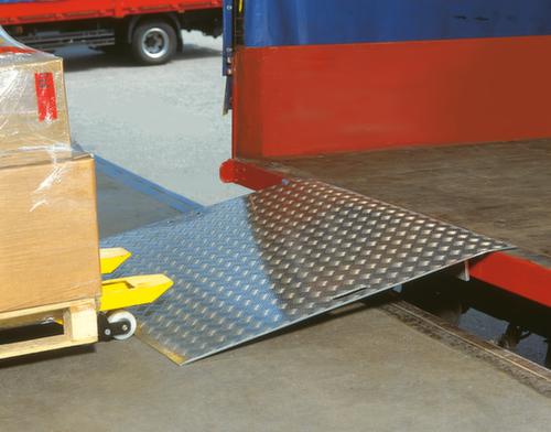 "longDescription": "<h2>Pont de franchissement</h2><strong>pour surmonter les écarts lors du chargement et du déchargement</strong><br><ul><li>Facile à transporter - avec des trous de préhension</li><li>Pas de glissement - angle d'arrêt pour la fixation</li><li>Travail en toute sécurité - avec une surface de roulement antidérapante</li><li>Léger et robuste - fabriqué en aluminium</li></ul>",