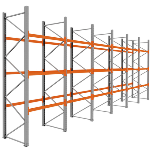Les principales dimensions du rayonnage à palettes en un coup d'œil :6 éléments standard avec chacun 3 niveau(x) avec traverses offrent une capacité de stockage pour 48 palettes au total. hauteurs de compartiments réglables par pas de 70 mm selon l’usage prévu et vos besoins. Chaque élément standard offre 8 emplacements pour palettes (stockage du sol incl.). entreposage longitudinal. Les traverses longitudinales sont accrochées à l'échelle à l'aide de mâchoires à trois crochets et d'une sécurité antidécrochage. utilisation unilatéral - conçu pour un montage mural. grande stabilité grâce aux supports de tablette avec profilés en caisson fermés. structure en acier. montants avec revêtement en zinc anti-corrosion. niveaux en RAL2004 orangé pur.