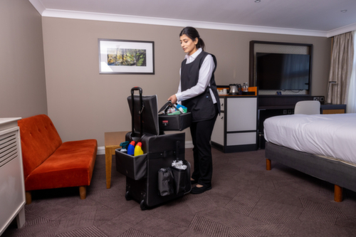 "longDescription": "<h2>Chariot de nettoyage</h2><strong>extrêmement maniable et robuste pour un usage intensif</strong><br><ul><li>Conception compacte pour une utilisation dans les hôtels, la gestion des installations et les activités de nettoyage.</li><li>Absolument durable - avec un revêtement en téflon contre l'eau, l'huile et les taches.</li><li>Facile à déplacer grâce aux roues à roulements à billes et à la poignée télescopique pratique en aluminium.</li><li>Beaucoup d'espace - différents compartiments pour divers ustensiles de travail et caddy amovible</li><li>Flexible et pourtant sûr - les séparateurs peuvent être divisés individuellement et ont un maintien ferme pendant le transport.</li></ul>",